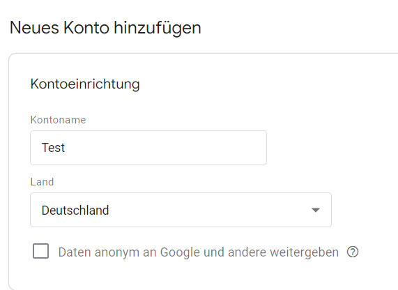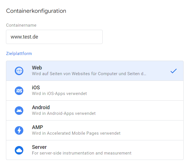 - (Es wird kein Konto in dem Sinne, sondern ein Container angelegt. Ein Container lässt sich im weitesten Sinne mit einer Property in der Google Search Console vergleichen.)