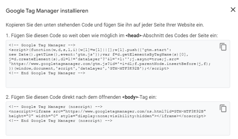 Es ploppt der Code auf, den man so weit oben wie möglich im <head> des Seitenquelltextes platzieren muss. Der Body-Tag ist nicht zwingend notwendig (eventuell für fortgeschrittene Tracking-Methoden erforderlich).