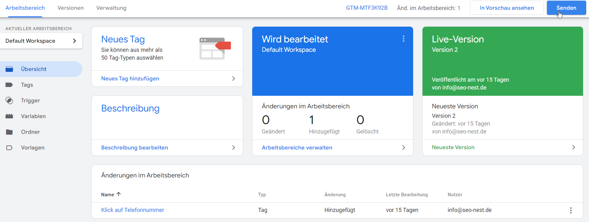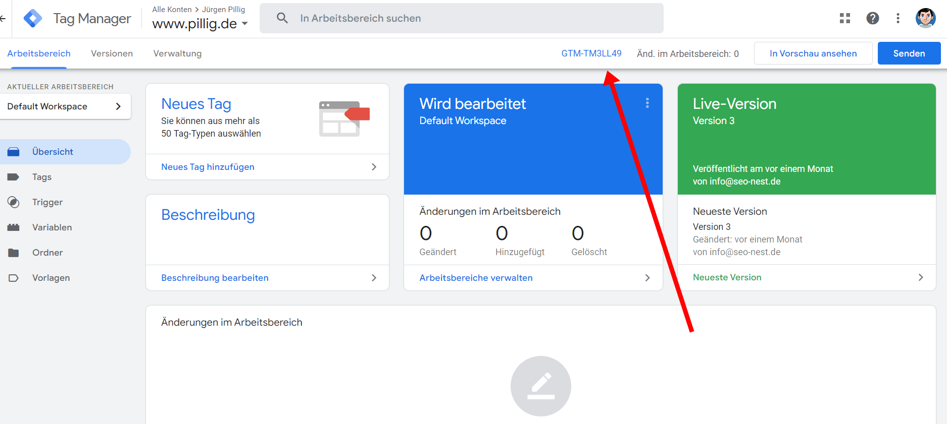 Wenn wir einen Container veröffentlichen, werden die Änderungen von Tag Manager auf die angegebene Umgebung angewendet. Falls man in einem Arbeitsbereich Tags, Trigger und Variablen hinzugefügt oder bearbeitet hat, muss man diese veröffentlichen. Nur so werden diese Änderungen auf der Website übernommen.