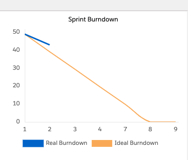 Die x-Achse zeigt die Stunden, die man im/für den Sprint noch zur Verfügung hat: 50 % der Arbeitszeit insgesamt. Bei einer 40-Stunden-Woche sind dies für den gesamten Sprint 20 Stunden, die im Idealfall mit 20 SP aufgefüllt werden. Täglich aktualisiert Salesforce hier die vergangenen Arbeitstage ab, sodass bspw. am zweiten Sprinttag noch 16 Stunden vorhanden sind.