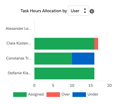 Als grüner Balken dargestellt, sind jene Storypoints, die dem User assigned und mit seiner verliebener Sprint-Arbeitszeit “zu schaffen” sind. Gehen die “Assigned-Storypoints” über die dem Teammitglied verbliebene Sprint-Zeit hinaus, wird dem grünen Balken dieser Überschuss an Storypoints als roter Abschnitt angefügt (“Over”). Ein blauer Abschnitt bedeutet wiederum, dass das Teammitglied weniger Storypoints übrig hat, als in der verbliebenen Sprint-Zeit zu schaffen wären. Durch diese Salesforce-Anzeigt lässt sich im Daily besprechen, inwieweit Storys im laufenden Sprint noch umverteilt werden können, um gemeinsam das Sprintziel zu erreichen. Die Übersicht ist aber natürlich immer mit Menschenverstand und den eigenen Informationen der aktuellen Situation zu interpretieren und auszuwerten.