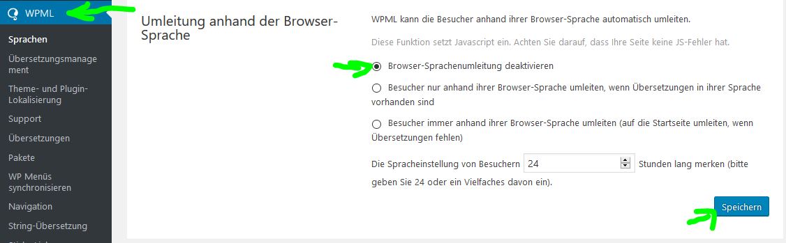 • Option AKTIVIEREN: „Browser-Sprachenumleitung deaktivieren“