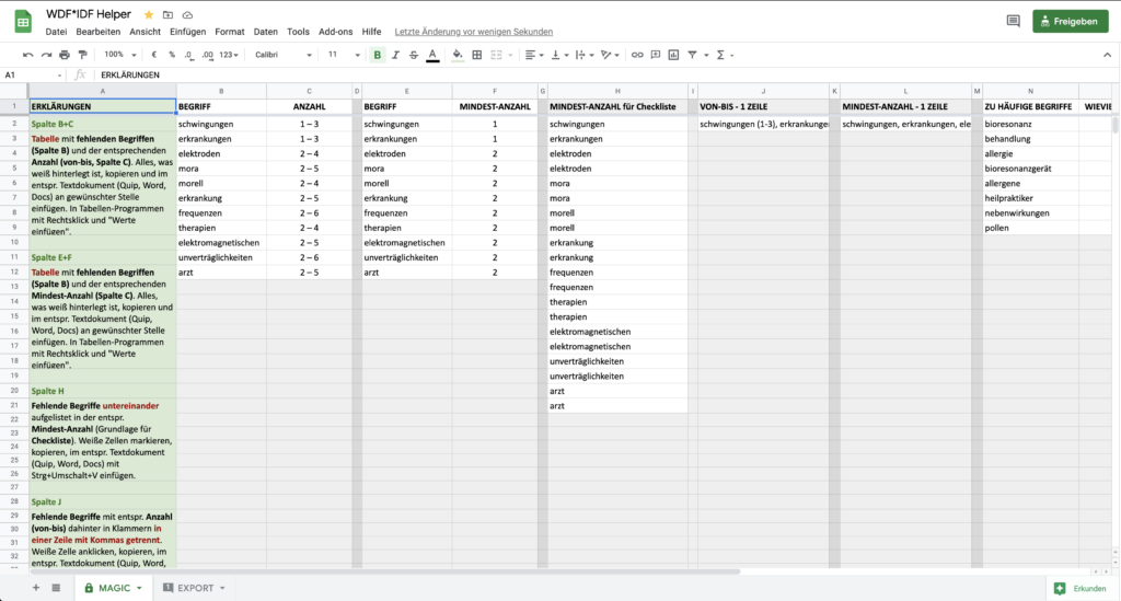 Tabelle mit fehlenden Begriffen (Spalte B) und der entsprechenden Mindest-Anzahl (Spalte C). Alles, was weiß hinterlegt ist, kopieren und im entspr. Textdokument (Quip, Word, Docs) an gewünschter Stelle einfügen. In Tabellen-Programmen mit Rechtsklick und „Werte einfügen“.